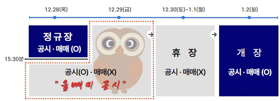 2023년 연말에도 이와 같은 올빼미 공시를 우려해 금융당국이 유의사항을 공지하고 2024년 첫 장이 시작되는 1월 2일에 올빼미 공시에 해당되는 공시를 한국거래소 전자공시시스템에 공지하기로 했습니다.
